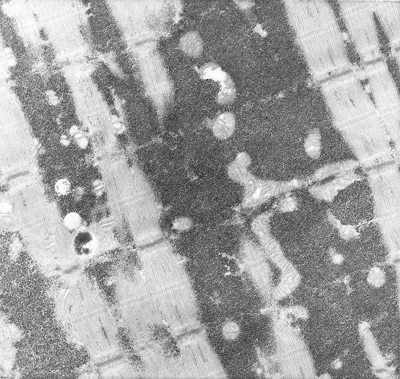 McArdle disease and glycogen accumulation: This image is taken from a case of McArdle disease. Note the accumulation of glycogen among muscle fibers.