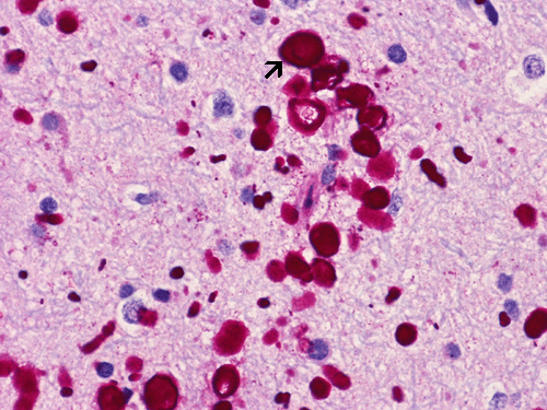Polyglucosan body disease, PAS stain: The polyglucosan bodies (arrow) are strongly positive for PAS stain due to their high content of polysaccharide. These polysaccharides are diastase resistant and therefore polyglucosan bodies are also visualized with PAS stain with diastase pretreatment. Note that the is a spectrum of different sizes of polyglucosan bodies in this image.