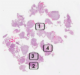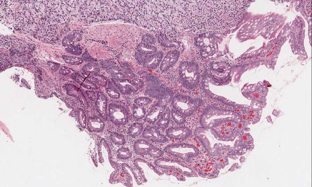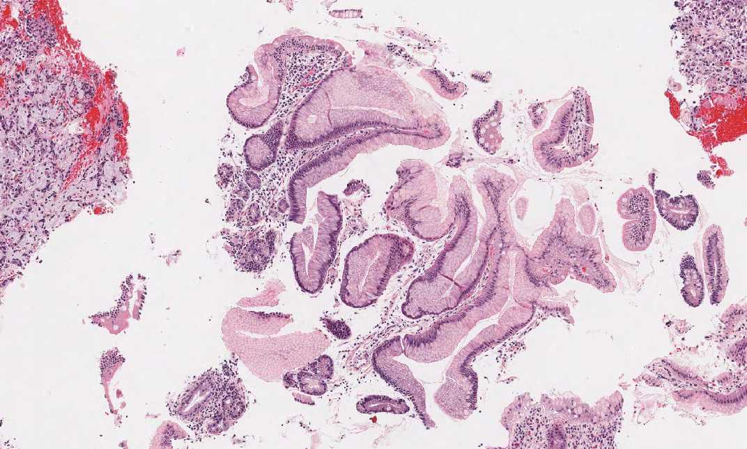Area 1: This is the area with gastric mucosa fragments. Note that intestinal metaplasia is present in some of the fragments. |