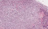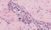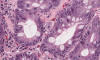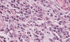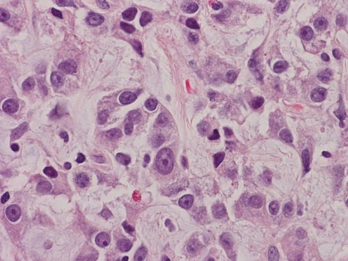 High magnification: A high magnification image shows round, and rather monontonous nuclei with prominent nucleoli and "salt and pepper" like chromatin. Although some adenocarcinoma can have this kind of nuclei, the nuclear features raise a serious concern of neuroendocine tumor. |