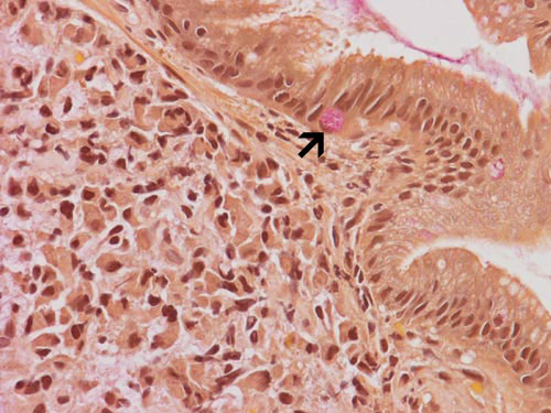 Mucicarmine stain: Although there is myxomatous stroma in this tumor, there is no genuine mucin production in the tumor cells. A mucicarmine stain demonstrates positive staining in the goblet cells (intestinal metaplasia) which serve as the internal control but not the tumor cell. |
