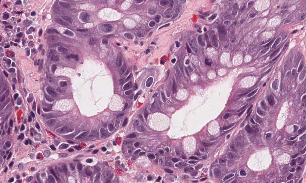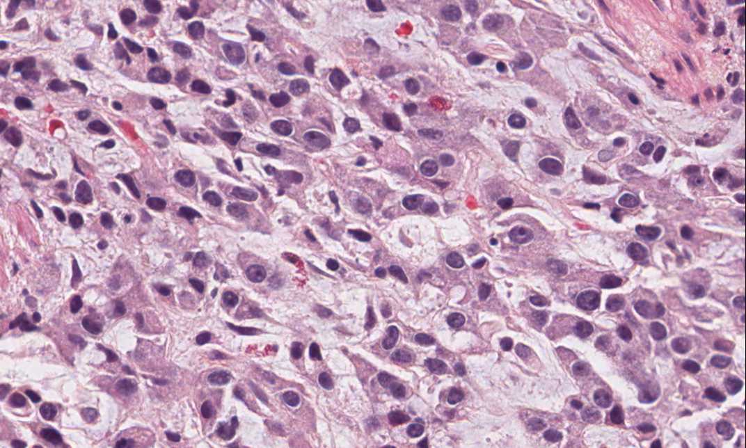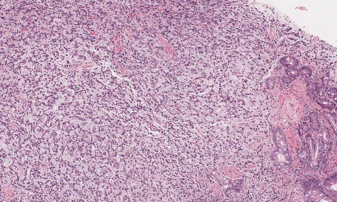 Area 3: The overall feature of the tumor is that of a cellular neoplastic epithelial proliferation with a myxomatous stroma and no distinct glandular formation. The overall arrangement of the tumor cells and the nuclear features suggest an neuroendocrine carcinoma. |