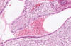 Edematous fluid and sometimes hemorrhage (not in this case) can be