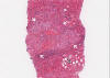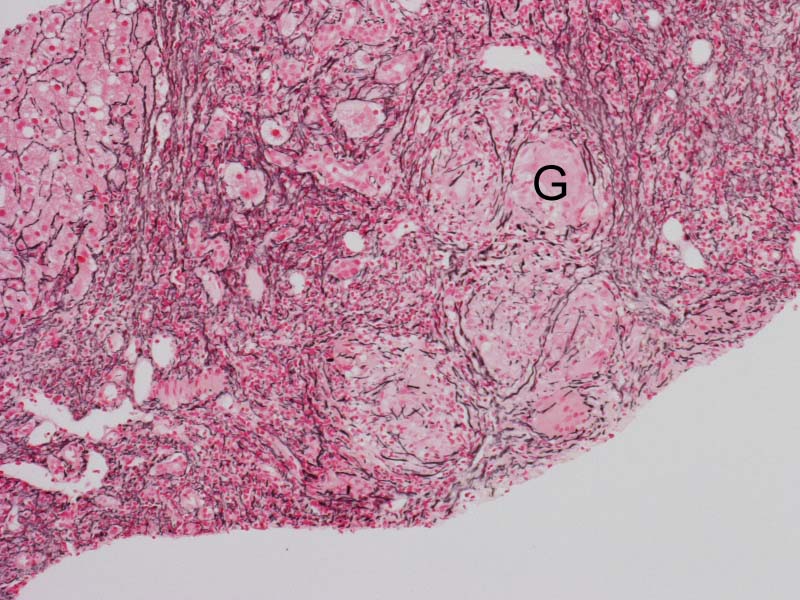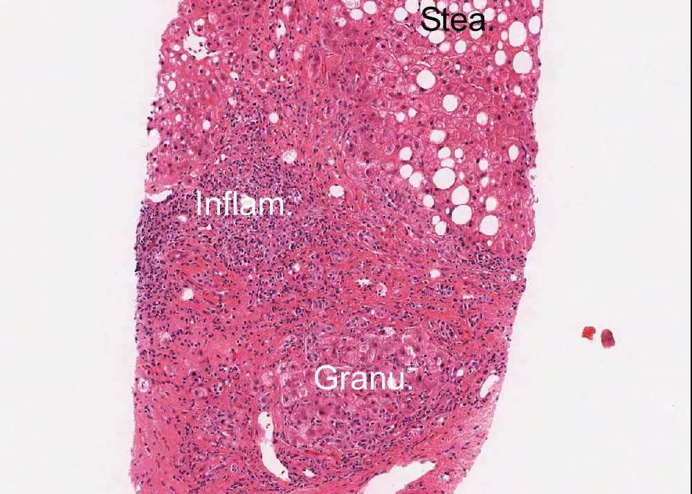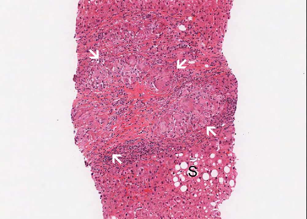 History: The patient was a 56 year-old African American woman who presented with constitutional symptoms of vague abdominal pain, fatigue and weight loss. Her past medical history was significant for hypertension and otherwise unremarkable. Physical examination was remarkable for abdominal fullness and hepatosplenomegaly. A chest and abdominal computed tomography scan showed normal pulmonary and mediastinal anatomy with a moderately enlarged liver and spleen. Her laboratory data, including routine chemistries and complete blood count, were within normal limits, albeit a borderline low platelet count. Liver function tests were normal. Anti-mitochondrial antibody (AMA), antinuclear antibody (ANA), antineutrophil cytoplasmic antibodies (ANCA) and anti-smooth muscle antibody were all negative. Hepatitis and CMV serologies were also negative. A liver biopsy was performed which generated the current specimen. A follow up test on serum angiotensin converting enzyme showed (ACE) elevation.