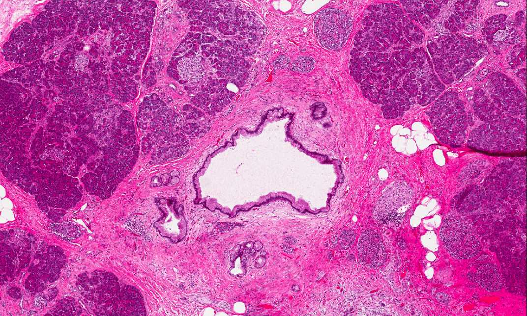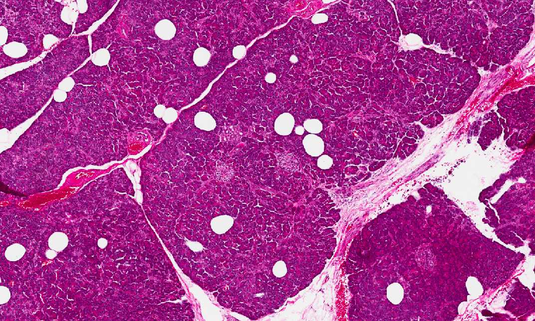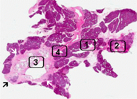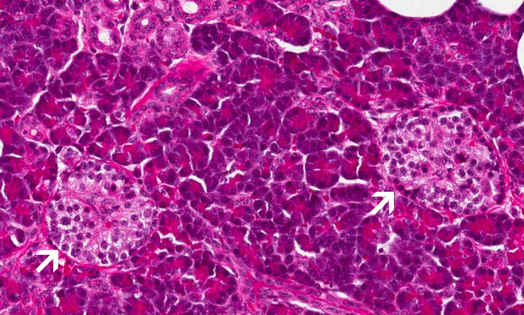 Area 1: Both exocrine and endocrine components are illustrated here. The islets of Langerhans are outlined by the arrows. |