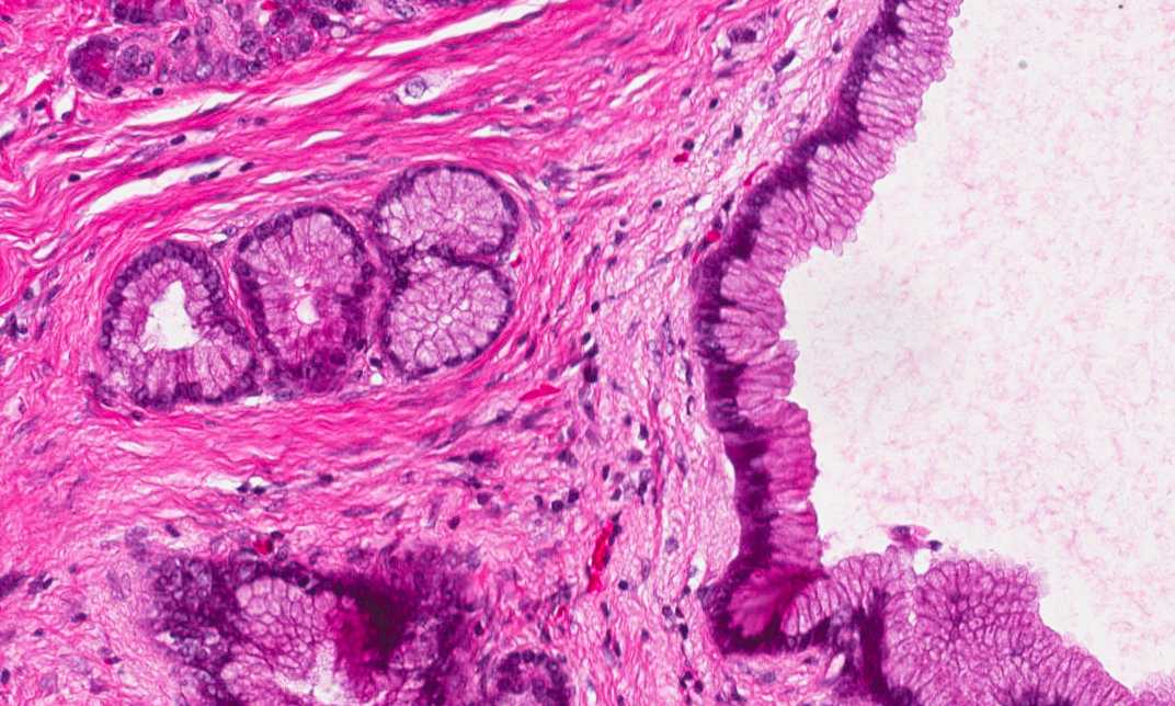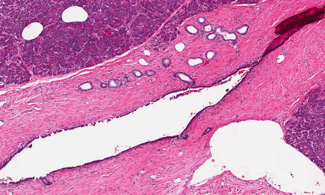 Area 4: In this area, there are some atrophic changes of the ductal epithelium. The atrophic chagnes may be secondary to obstruction produced by the tumor. |