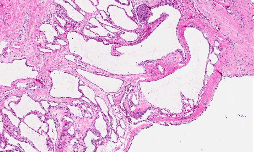 Area 3: The tumor is composed of numerous cysts of variable size separated by fibrous septa of variable thickness lined by a single layer of cuboidal clear cells with bland nuclei. Entrapped islets may be seen within the septa but they are not present in this case. In some areas, the lining seems to have more than one layer and most of these areas are due to tangential cut of the cysts. |