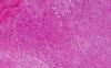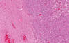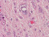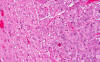 Area 2: Geographic areas of necrosis (N) is present in this tumor (T). Note that no pseudopalisading necrosis, one of the salient features of glioblastoma, is not see here. Compare the necrotic area in high magnification with that of the viable tumor cells. Note the loss of cellular details. |