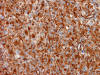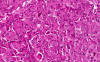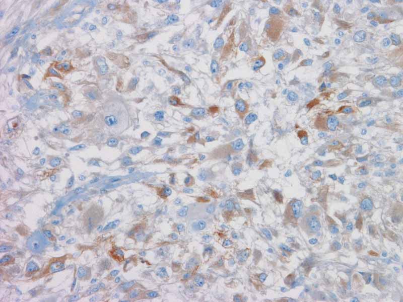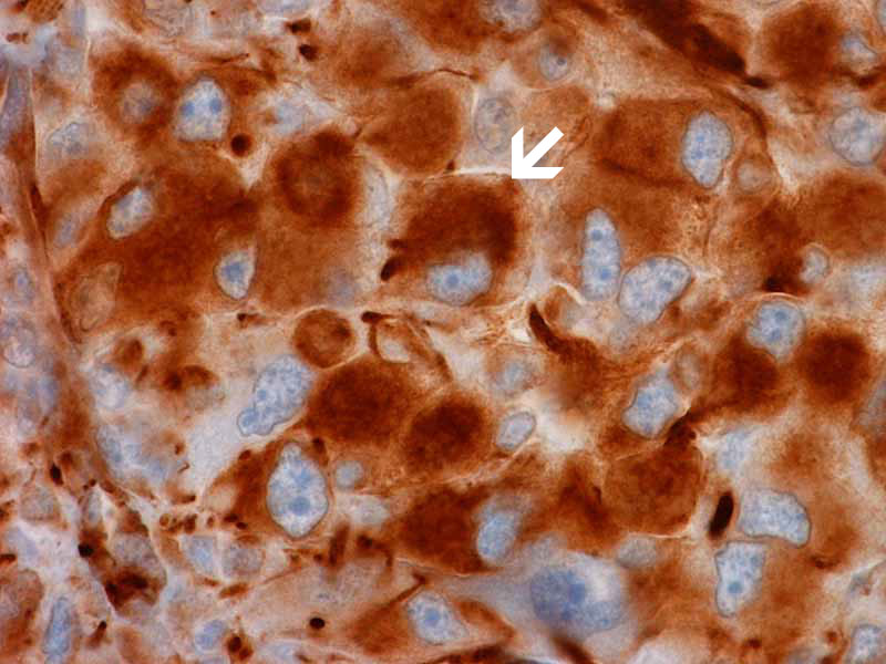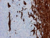 Vimentin: Practically every cell is immunoreactive for vimentin. Note the belly of strongly positive cytoplasm in the tumor cells. This feature is rather characteristic for rhabdoid cells. |
