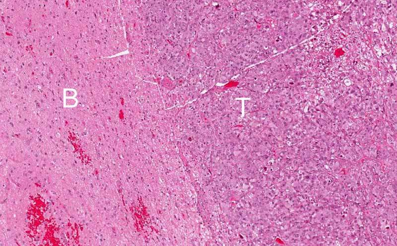Area 3: The tumor (T) is overall very well demarcated from the surrounding brain tissue (B). This is also an unusual feature of glioblastoma or anaplastic astrocytoma which usually have an infiltrative margin. This features also explain why the tumor appears well demaracted enough to suggest meningioma on imaging studies. |