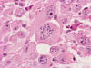 This image is taken from another slide of this case. In this area, the rhabdoid features are more prominent. Rhabdoid changes are featured by a large nuclei with prominent nucleoli. The cells is typically in an oval shape with a large belly of cytoplasm that pushes the nucleus to an eccentric location. Within the belly of cytoplasm is often a faintly defined inclusion body like body which may appear fibrillary on hematoxylin and eosin stain. This structure is composed largely of vimentin and will be strongly highlighted by immunohistochemistry for vimentin. |