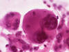 This image is taken from the cytologic prepartion of this case at the time of intraoperative consultation. The rhabdoid features are well shown here. Many multinucleated tumor giant cells are present. |