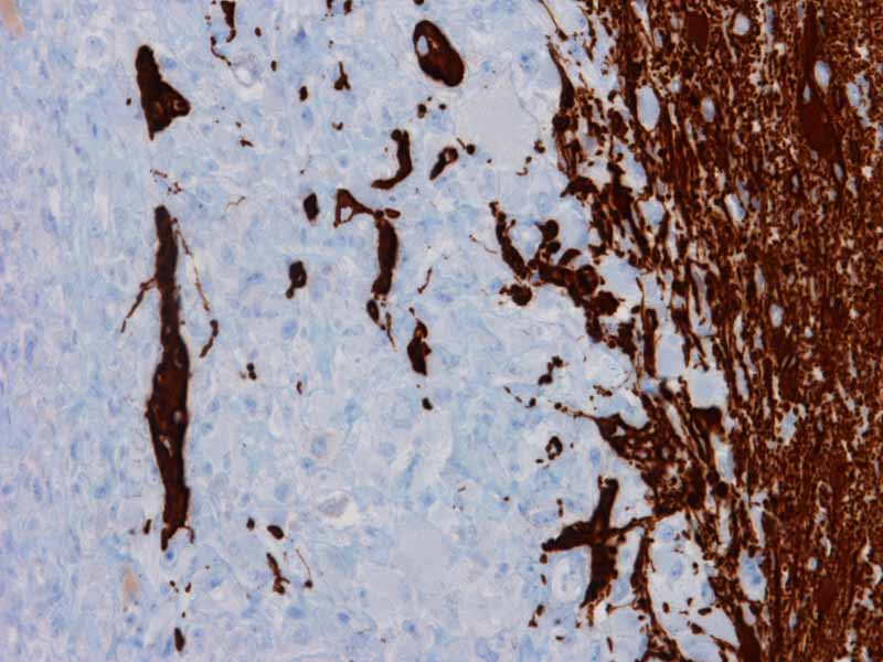 Glial fibrillary acidic protein (GFAP): Focal but strong immunopositivity is present in this tumor. |