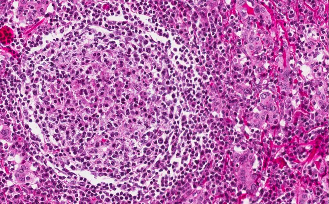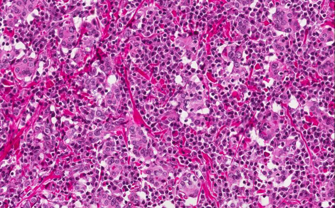 Capsule Summary: Hashimoto thyroiditis is a rather common disease. It falls into the spectrum of autoimmune thyroid diseases. The thyroid follicles is gradually destroyed by a variety of cell or antibody mediated immune processes. Patients often have hypothyroidism and episodes of hyperthyroidism. Antibody against the thyroid glands may be present in the blood. Histologically, it is characterized by extensive destruction of thyroid follicles, intense lymphocytic infiltration predominantly of T-cells, lymphoid follicle formation and Hürthle cell formation. Hashimoto thyroidits is a risk factor for the development of non-Hodgkin's lymphoma of the thyroid. For this reason, the specimen must be thoroughly sampled. [more on clinical features of Hashimoto thyroiditis]