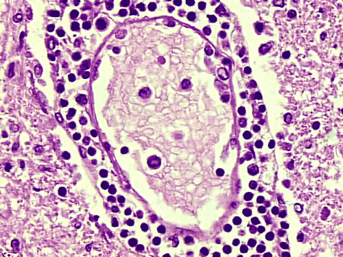 The brain and spinal cord may appear swollen but are usually free of focal lesions. Histopathologically, rabies is a widespread polioencephalomyelitis. Leptomeningeal and parenchymal perivascular lymphocytic infiltrations are usually present but often not intense. Neuronophagia can also be seen. The amount of inflammation of the case under discussion is, in fact, on the intense side of the scale. The pathognomonic Negri bodies 10, 11, 12 are sharply delineated, round to oval, eosinophilic, neuronal cytoplasmic inclusions; first described by Negri in 1903 10. These inclusions are often solitary but may also be multiple in a single neuron. Lyssa bodies refer to less well delineated and more pleomorphic neuronal cytoplasmic viral inclusions. Babes’ nodules refer to clusters of microglia that remain after destruction of neurons. When immunohistochemistry is employed, the distributions of viral antigen are far more extensive than that estimated by conventional light microscopy 13. Negri body and rabies viral antigen as demonstrated by immunohistochemistry are most commonly seen in large neurons of the hippocampus (Pyramidal cells), cerebellum (Purkinje cells), thalamus, basal ganglia, cerebral cortex and in the brain stem, especially gray matter of the pons and medulla. They are also found in spinal cord motor neurons and dorsal root ganglion, especially in the paralytic form. Immunohistochemistry also demonstrated rabies viral antigen in astrocytes and oligodendrocytes 13. Characteristically, a striking discrepancy between the degree of inflammation and amount of inclusion bodies is observed, as in our case, in many cases.