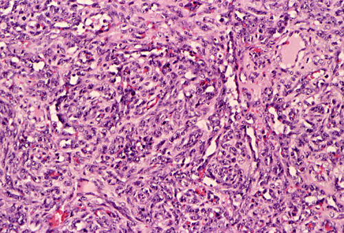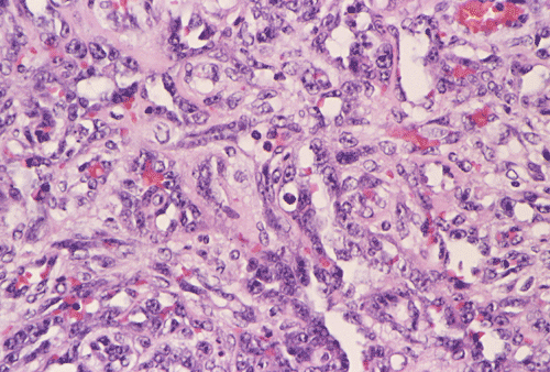 irregular, anastomizing vascular channels lined by plump, hyperchromatic, and