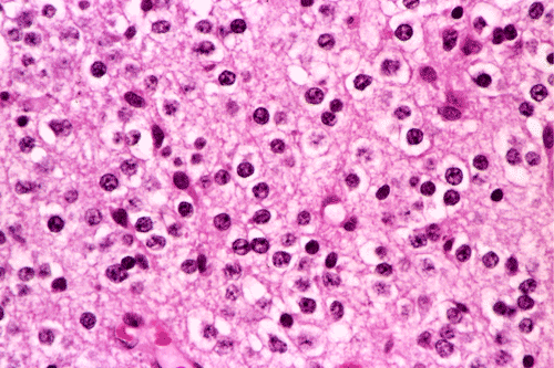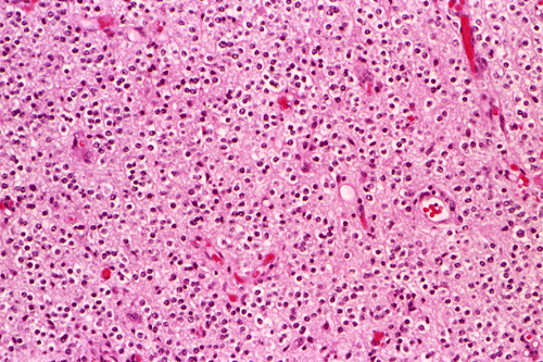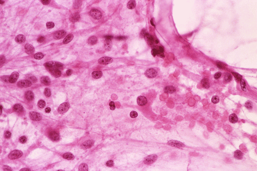 Microscopically, pilocytic astrocytomas characteristically contain alternating densely packed areas and loosely packed areas. The cellularity is moderate but can be focally hypocellular or hypercellular. The tumor cells have elongated, coarse, hair-like cytoplasmic processes. The nuclei are usually bland, small to medium sized and has open chromatin. A variety of patterns can be seen. The loose tissue is composed of minute vacuoles, microcysts, and eosinophilic fluid-filled spaces, which can coalesce into larger structures. A variety of histologic patterns as illustrated in this case can be found. Rosenthal fibers, varying in amount from a few to substantial, may be found and are particularly common in the fibrillary areas. Eosinophilic granular bodies are aggregates of eosinophilic globules and they are often found in pilocytic astrocytoma. Their presence is related to the benign nature of these tumors. Glomeruloids of blood thin walled blood vessels are also common findings. Extension into the leptomeninges is common and does not signify malignant behavior. Tumor necrosis is an uncommon features and should be distinguished from infarction of tumor. In longstanding cases, degenerative atypia may occur. The proportion of cycling cells as measured by immunohistochemistry for Ki67 is usually under 5%. Occasional mitoses may be found but they are not indication of aggressive behavior.