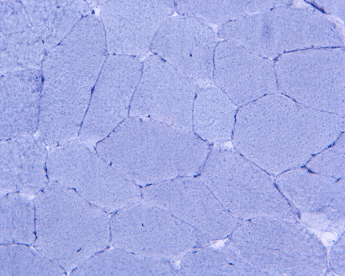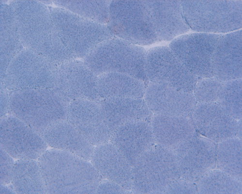 Pathology: MADD does not lead to morphological changes per se. Adenylate deaminase can be easily demonstrated by histochemistry on frozen sections. The reaction is a tetrazolium-based reaction and the reactive product is blue. Biochemical analysis can confirm the deficiency and the isoform. The truncated protein cannot be demonstrated by immunofluoresence.