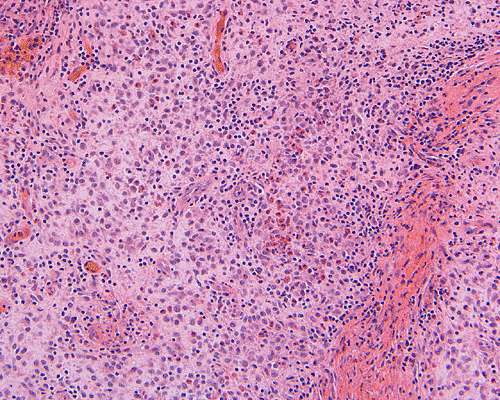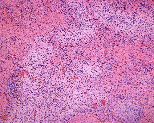 Granulomatous inflammations such as tuberculosis can mimic Langerhans’ cell histiocytosis.. Radiographically, Langerhans’ cell histiocytosis almost never show contiguous involvement of adjacent vertebrae or collapsed intervertebral disk as in tuberculosis. Processes with poorly defined granulomas are most likely to be confused with Langerhans’ cell histiocytosis. Identification of the microorganism associated with the granulomatous inflammation is always helpful but not always possible. The presence of caseous necrosis surrounded by palisading histiocytes is also consistent with granulomatous inflammation.
