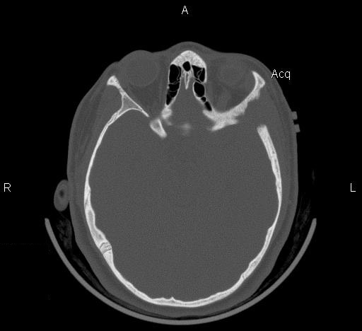 Clinical information: The patient was a 13 year-old girl who presented with worsening headache and some difficulties with memory, concentration and attention. MRI studies disclosed a 2.1 x 1.9 x 1.8 cm enhancing mass in the left temporal bone and sphenoid wing. The mass extended intracranially and abuts the left temporal bone accompanied by dural enhancement at that location. There is also extension through the bone into the submuscular temporal region. The following photos are taken from representative regions of the lesion. Panel 1 and 2 are CT scans at soft tissue and bone density respectively. Panel 3 and 4 are T1 weighed images without and with contrast respectively. Pandl 5 is proton density image. Panel A to D are cytologic (squash) prepartion for intra-operative consultation. Panel E and F are frozen sections for intraoperative consultation. Panel G to L are paraffin embedded sections.