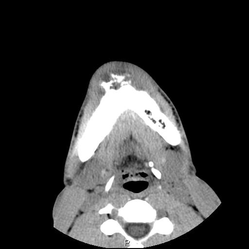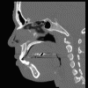 Clinical information: The patient was a 23 year-old man who went to see the dentist because of dull pain, swelling of the chin, and loosened lower front teeth. He was referred to this hospital after initial examination. A CT scan was performed and and a biopsy was taken. Representative images are presented here. Panel D is a sagittal reconstruction from axial CT scans. A resection was subsequently performed.
