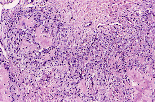 Osteosarcoma is a malignant tumor characterized by direct formation of bone or osteoid by the proliferating neoplastic cell. Other than sharing this characteristic, osteosarcoma is one of the most heterogeneous tumor from the histopathologic perspective. The histologic features vary from different areas of the same tumor and among different tumors. In general, several major patterns are recognized: osteoblastic, chondroblastic, fibroblastic, giant-cell rich, small cell, telangiectatic, and others. The amount of osteoid and ossified tissue can vary tremendously and it is not uncommon that it can only be found after careful search. The osteoid can form well-defined structures that mimic trabecular bone or as irregular deposits. The current trend is to classify osteosarcomas into low- and high-grade tumors. It is the histologic grade rather than tissue pattern that has greatest bearing on prognosis.