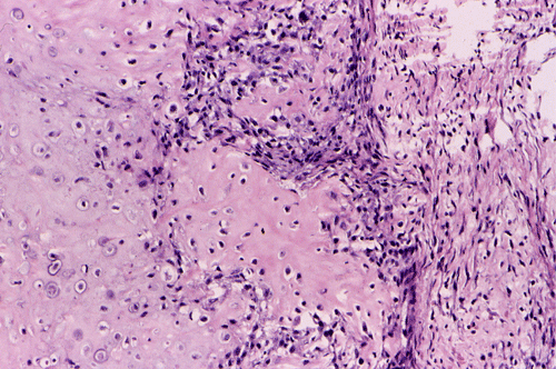 Similar to osteosarcomas arising from the flat bones and ribs (e.g., osteosarcomas of the pelvic bones), about 30% of the osteosarcomas of the jaws are chondroblastic type and contain a substantial amount of cartilage. Lobules of neoplastic cartilage may dominate the histologic picture in some cases and osteoid production by the neoplastic cells may occur only focally. The cartilaginous differentiation can be heterogeneous and represent all stages of cartilaginous matrix formation. Stigmata of malignancies including nuclear pleomorphism, mitosis, atypical mitotic figures, and necrosis can all be seen in osteosarcomas.