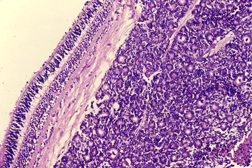 The pathology is typical for that of a small blue cell tumor with morphologic and immunohistochemical features comparable to medulloblastoma, supratentorial primitive neuroectodermal tumors, and adrenal neuroblastomas. Tumor cells have small to medium sized, hyperchromatic nuclei with clumpy chromatin and without prominent nucleoli. Only a small to minute amount of cytoplasm is present. Mitotic figures are numerous. Retinoblastoma has a striking tendency to undergo necrosis. The tumor cells that are closer to the blood vessels are more likely to remain viable. Calcifications are common findings in the necrosis. Some of the nucleic acid liberated from these necrotic cells becomes absorbed in the walls of blood vessels giving them a deep blue appearance.