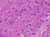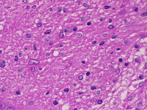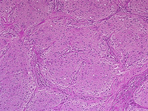 Microscopically, ONG in children are almost all pilocytic astrocytomas. The optic nerve is expanded. The fibrovascular septa within the optic nerve are separated by the tumor cells but the structure can still be well recognized as an optic nerve on cross section. Three major patterns are recognized 1. In the first pattern, the tumor is finely reticulated. In the second pattern, the tumor has microscysts and is coarsely reticulated. In the third pattern, the tumor cells are coarsely fibrillated, spindle shaped, and form bundles. There is minimal pleomorphism in the nuclei and it is not always easy to separate the neoplastic cells from adjacent reactive gliosis. There is a usually lack in mitotic activity, endothelial proliferation, and necrosis. Immunohistochemistry, the tumor cells are strongly reactive for glial fibrillary acidic protein (GFAP).
