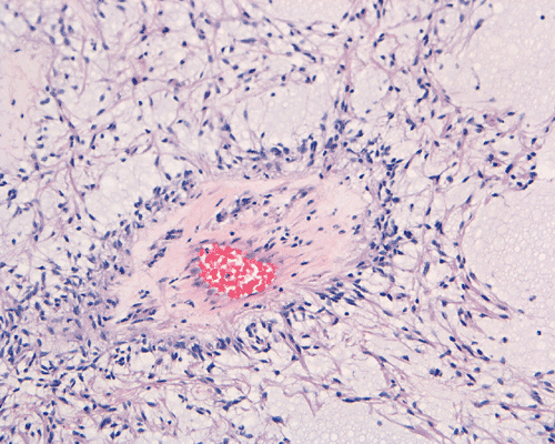 In a substantial amount of area, the tumor is composed of spindle cells with prominent perivascular arrangment and microcyst formation (Panel A and B). These vessels are surrounded by a thin rim of bipolar spindle cells (Panel C). The paucicellular perivascular mantle that is typical for ependymoma is absent in these perivascular arrangements. Adjacent to these perivascular arrangment is substantial amount of myxoid changes. On high-magnification, the tumor cells appear bland in histology, bioplar and spindle in shape, and admixed with a large amount of myxoid substance (Panel D and E). There is a lack of mitosis or significant pleomorphism. In some areas, the tumor is composed exclusively of spindle cells in a myxoid background with microcyst formation but without perivascular coronary arrangement of tumor cells (Panel F). It is not uncommon to observe areas with spindle cells clinging to the blood vessels (Panel G). In a minority of areas, there is increase in cellularity (Panel H). Some vessels seem to be composed of glomeruloids of blood vessels with plump endothelial cells (Panel I).