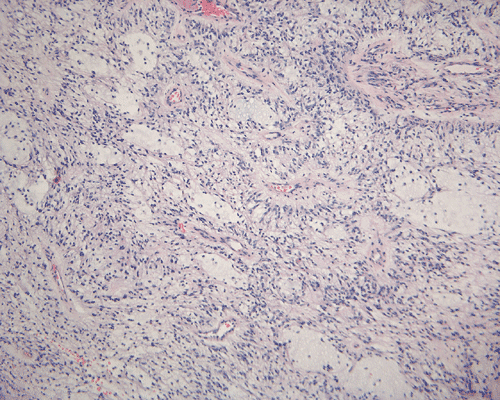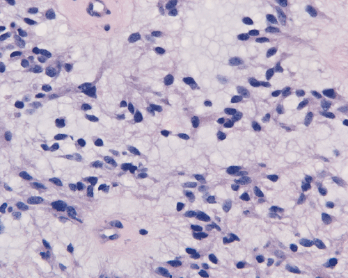 Pilocytic astrocytoma is an indolent tumor of WHO grade I. The vast majority of them are seen in children. The most common location is the cerebellum but they can be found throughout the brain and spinal cord. Pilocytic astrocytomas arising in optic nerve, optic chiasma/hypothalamus regions are often associated with neurofibromatosis 1. Radiographically, cerebellar pilocytic astrocytomas are typically cystic, with a mural nodule, and enhancing. The salient histologic features are elongated, bipolar cells with long, cytoplasmic process. The tumor cells tend to arrange in a densely-packed, loosely packed pattern. However, other patterns including a clear cell pattern that mimics oligodendroglioma may be present. Rosenthal fibers and eosinophilic granular bodies are often but not always found. Mitotic figures are absent or, at most, uncommon. No substantial nuclear pleomorphism is present. Glomeruloids of thin walled blood vessels are also a common finding. In contrast to PMAs, areas with microcystic changes and myxoid changes are only focal. In the study by Tihan et al., the 13 hypothalamic tumors with classic features of pilocytic astrocytomas shows much better prognosis, no dissemination through the CSF and no patient died of disease 1 . [Click here to see a case of pilocytic astrocytoma]