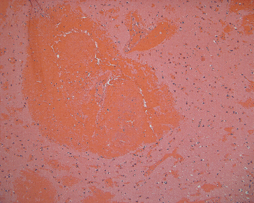 Microscopic neuropathologic findings: Microscopically, the basal ganglia has hemorrhage that are rimmed by a thin layer of necrotic tissue. There are no reactive changes, acute or chronic inflammatory cell infiltration, vasculitis, new vessel formation, or hemosiderin deposition. A reticulin stain is performed and found no evidence of vascular malformation. Pathologic changes in samples that are obtained from different hemorrhagic areas from both cerebral hemispheres appear to be similar and are consistent with the early stage of acute hemorrhage. No necrosis, neuronal death or hemorrhage are identified in the brainstem.