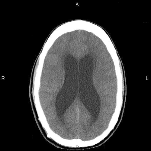 A poorly defined lesion is identified in the pineal region of the CT scan. The increased density suggest calcifications (Panel A). A moderate degree of hydrocephalus is also present (Panel B).