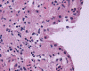 Intraoperative consultation: The specimen is that of a streotactic biopsy and is very small. The intraoperative cytologic preparation was rather hypocellular. Small clusters of cells with bland nuclei and foamy cytoplasm are present and they are highly suggestive of foamy histiocytes (Panel C). On frozen section, there are many small lymphocytes in a "pink" background that can be a granulomatous process (Panel D). In some areas, many foamy macrophages are present and one particular fragment appear to be a possible portion of a wall of structure with lining cells suggestive of macrophages (Panel E).