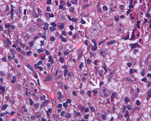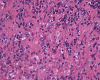 Germinomas can elicit an atypical gliosis in the surrounding glial tissue which may be confused with malignant glial neoplasms. This is true particularly of specimens taken from the periphery of the germinoma. The tumor may appear as a desmoplastic tumor. The inflammatory response may be problematic in reaching a histologic diagnosis, especially in small biopsies, as macrophages can be difficult to distinguish from a non-seminomatous neoplastic component.