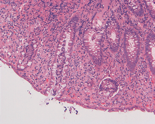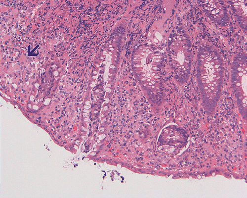 Although autopsy findings have identified the presence of Histoplasma capsulatum in the gastrointestinal tract of 70-90% of patients with progressive disseminated histoplasmosis 10, 14, 15, H. capsulatum is uncommonly recognized as the causative agent in gastrointestinal disease. This organism is considered to be the etiologic agent in only 3-12% 16,17 of patients with gastrointestinal clinical symptoms perhaps due to the non-specific clinical presentation of gastrointestinal histoplasmosis. The most common symptoms include abdominal pain, fever, diarrhea and weight loss. Intestinal obstruction, gastrointestinal bleeding and perforation are less frequently reported 16. Common clinical manifestations include ulcers, hemorrhage, nodules and masses 18 which can mimic inflammatory bowel disease or malignant process making the diagnosis challenging 19. Gastrointestinal involvement in disseminated histoplasmosis can involve any segment of the gastrointestinal tract containing lymphoid tissue. Terminal ileum, therefore, is the most frequent site of involvement in the GI tract due to the abundant amount of lymphoid tissue 20.
