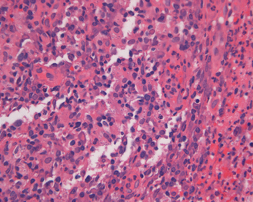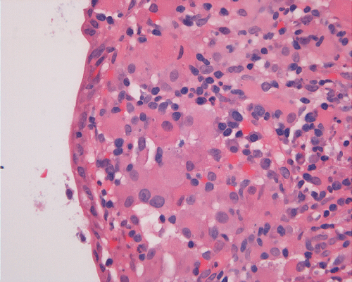In immunocomprised patients that have defective cellular immunity, granuloma formation may be rather indistinct as illustrated in our case. The yeast form of Histoplasma capsulatum is found in tissue and they are usually under 5 mm in diameter and appear as ovoid yeasts. The lung is the most affected organ. Granuloma formation, typically multiple, with extensive caseous necrosis and a variable amount of calcifications are the typical pathologic changes in the lung. These granulomas are often demarcted from the surrounding tissue by a fibrous wall. Granulomas in the lung can get quite calcified with time. The pulmonary nodules can also enlarge slowly to give a wrongful clinical impression of neoplasm, the so-called histoplasmoma. The living yeast in tissue, often occur in clusters, has a basophilic center and a translucent halo that represents the capsule. They are often engulfed by histiocytes as illustrated in this case. Dead organisms appear eosinophilic and cannot be detected easily in granuloma by hematoxylinj-eosin stain. The microorganism is numerous and can be identified on routine hematoxylin-eosin stain with astute observation and high index of suspicion. Typically, there are numerous yeasts and they are present even in heavily calcified nodules or granulomas.