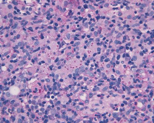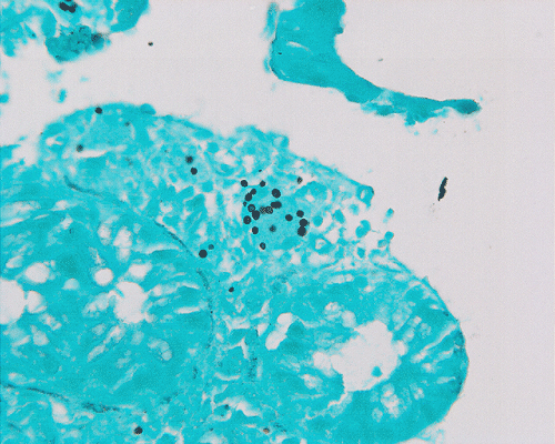 H. capsulatum, like many other fungal organisms, are well demonstrated by periodic acid Schiff (PAS) stain, Gomori’s methamine silver (GMS) stain, and other appropriate stains in tissue. Although the size and shape can suggest Candida species, there is no pseudohyphae formation in H. capsulatum which allows the distinction. They also lack the paired dense capsular thickening as in Pneuocystis carinii. Coccidiodes immitis form large endospores which allow separation from H. capsulatum. [Click here to see a picture of C. immitis with GMS stain]
