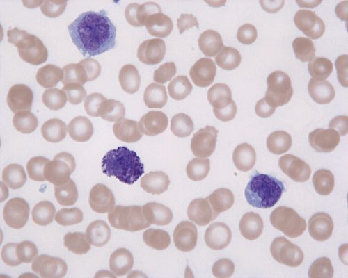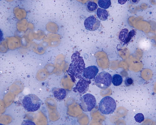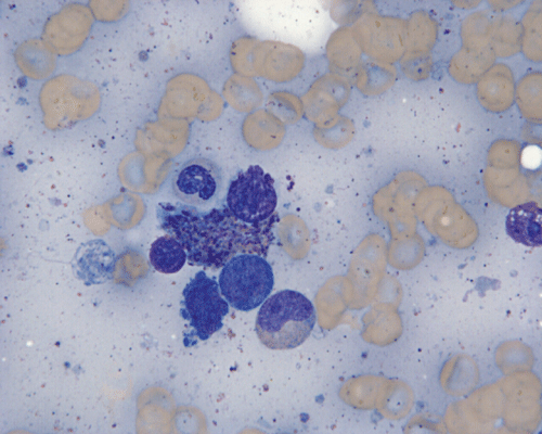 Normal mast cells have a round or oval, centrally located nucleus with uniform distribution of dark purple granules in the cytoplasm. Mast cells are well demonstrated by toludine blue and Giemsa stains, and also by immunohistochemistry for CD 117 or tryptase. Napthol ASD chloracetate esterase also highlight mast cells specifically. Mast cells are also positive for CD45, CD33, and CD68 but these markers are less specific than tryptase. Bone marrow aspirations stained with Giemsa are most useful for recognizing atypia in mast cells. It should, however, note that Giemsa stain may be false negative in formalin fided tissue. Hallmarks of atypia in mast cells include spindling of mast cells, hypogranulation, uneven granule distribution, and nuclear lobulation. Recognition of the so-called mast cell granuloma, in which mast cell aggregrates are associated with lymphocytes and eosinophils can be helpful.