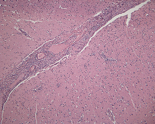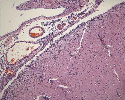 Clinical information: In August, a previously healthy 11 year-old boy was presented to a clinic with the initial complain of headache. A few hours later, he started to have nausea and vomiting. The vomiting became bilious later. There was no associated diarrhea, cough, or rash. The patient became progressively listless and lethargic. He was treated by his physician but his condition continue to deteriorate. One day later, he was hallucinating, confused, and had brief episodes of stiffening. The child was admitted to the emergency room on the same day. Blood cultures for bacteria and enterovirus were negative. On admission, he was obtunded and had some photophobia but he was spontaneous opening of eyes and some purposeful movement. The peripheral white blood cell count was 24,600 cells/mm3 with 79% neutrophils. For the cerebrospinal fluid (CSF), the glucose level was 58 mg/dl, protein was 256 mg/dL, and there were 2079 white blood cells per mm3 and there were 79% neutrophils. A test for Cryptococcus neoforman antigen was negative in the CSF. A diagnosis of meningitis was made and the child was treated with vancomycin and ceftriaxone. His condidtion did not improve. A CT scan revealed evidence of increased intracranial pressure and tonsillar herniation. An MRI scan revealed diffuse cerebral edema. The lateral and fourth ventricles were totally effaced and there was uncal and tonsillar herniation. There was also focal patchy changes in the left cerebellum and globus pallidus that are suggestive of infarction. There was also diffuse enhancement of the leptomeninges, bilateral frontal lobes and bilateral temporal lobes. He also had high fever with a temperature of 40.3 ˚C.