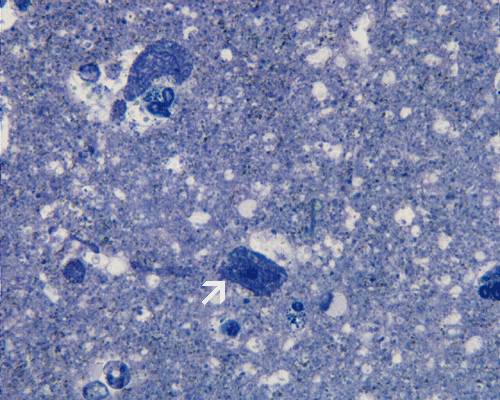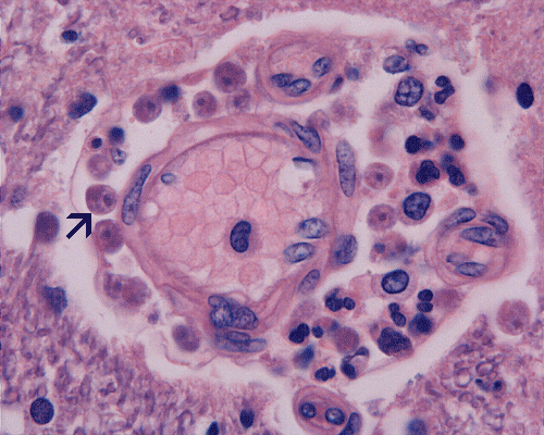Under the electron microscope, the microorganisms in the Vichow-Robin space appear as round cells with many phagocytic or lysosomal vacuoles. A large nuclei with chromatin lined nuclear membrane and large, prominent nucleoli is also helpful in identification.