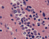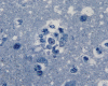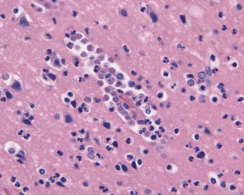 Microscopically, it is essentially an acute, necrotizing meningoencephalitis with or without hemorrhage. There is intense perivascular inflammatory cell infiltration in the leptomeninges and in the parenchymal blood vessels and the inflammatory cells is typically a mixture of lymphocytes, mononuclear cells and substantial amount of neutrophils. Degenerated polymorphonuclear leukocytes are common. Necrosis associated with the inflammatory infiltration is common. N. fowleri are found predominantly in the Vichow-Robin space as round cells about 10-20 mm in diameter. They have pale vesicular nuclei and prominent nucleoli with chromatin lining the nuclear membrane. The cytoplasm is amphophilic and may appear vesicular or bubbly. Periodic acid Schiff stain does not offer any advantages in identification of these cells. Masson’s trichrome may be helpful. When N. fowleri are found in the parenchyma, they may appear polymorphic and not round. Astute recognition of the nuclear feature is the key to find these cells in the parenchyma. In contrast to Acanthoamoeba species, N. fowleri does not have cyst formation. This feature allows differentiation.