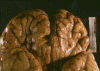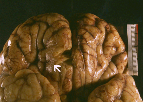 The brain is extremely edematous and therefore heavy as illustrated in our case. The extreme edema will produce uncal and tonsillar herniation which is usual cause of death. There is a thin layer of purulent exudates on the leptomeninges. On cross sections, small hemorrhagic foci can be observed.