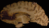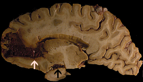 Grossly, the smaller hemorrhage tends to be superficial rather then deep. For large hemorrhages that have deep extension, it may not be possible to tell whether the epicenter of hemorrhage is superficial or deep. Their superficial location tends to make a small amount of subarachnoid hemorrhage. Extension into the ventricle is uncommon. Typically, small hemorrhage at different stages of resolution is present. The hemorrhages are found as lobar hemorrhage in the white matter in contrast to the hemorrhages that are found in hypertension and are often found in the basal ganglia. CAA hemorrhage is almost always cerebral with the brainstem and cerebellum rarely affected. This is an interesting phenomenon as the cerebellar folia have a large surface area and numerous leptomeningeal blood vessels. CAA hemorrhagedoes not appear to have a predilection to occur in leptomeningeal vessels although these vessels typically contains amyloid deposition in the wall.