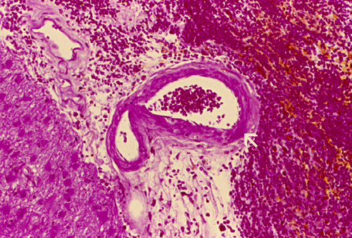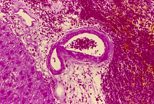 Cerebral amyloid angiopathy (CAA) is a very common cause of intracerebral hemorrhage, perhaps only second to hypertensive intracerebral hemorrhage in frequency. They are usually seen in normotensive adults over 60 years of age and occur almost always as cerebral hemorrhage. Hemorhages due to CAA tend to be superficially located and have a distribution distinctly different from those resulted from hypertension. The superficial distribution is mainly because amyloid deposition in CAA is found in the moresmall, superficial vessels and leptomengial vessels. The amyloid can be detected by Congo red, thioflavin S, and immunostaining. The Icelandic and Dutch types of CAA are hereditary. The commonest and sporadic form is due to deposition of (b-amyloid) Ab peptide in the blood vessels. CAA have also been described in some British and Danish families. Deposition of Ab is also a common feature of Alzheimer’s disease, normal aging, and Down’s syndrome.