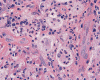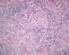 Histiologically, the features of cranial RDD are similar to those occurring in the lymphnodes. Lesions are composed of sheets or syncytia of large, pale histiocytic cells with abundant granular eosinophilic cytoplasm and ill-defined or feathery cytoplasmic borders in a lymphocytic, chronic inflammatory cell background. Extranodal sites commonly exhibit a degree fibrosis and this can obscure the visibility of the histiocytic proliferation. Nuclei of the large histiocytes vary in size and may be large, round and vesicular with smooth nuclear contours 2. A mild degree of cytological atypia is commonly seen. Most nuclei contain a single small nucleolus, but others possess multiple nucleoli or a single prominent nucleolus. Mitotic figures are usually difficult to detect or are absent altogether. The prominent background of chronic inflammation is largely comprised of a mature plasmacytic infiltrate with interspersed lymphoid follicles 2. Emperipolesis is consistently found in nodal disease and often is less evident at extranodal sites. Its recognition is key to correct diagnosis.