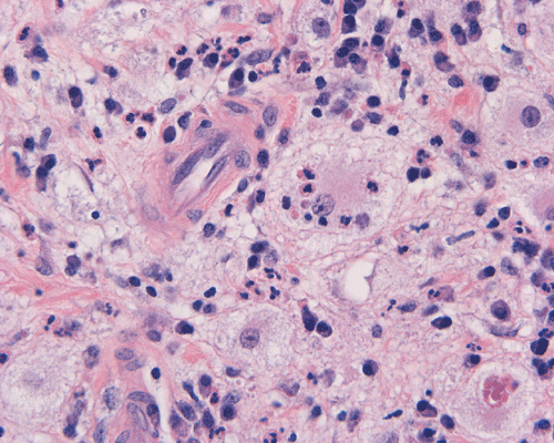 Histologic differential diagnostic considerations include several hematopoietic and primary CNS lesions. Primaries among these are lymphoplasmacytic-rich meningioma, Langerhans cell histiocytosis, hemophagocytic lymphohistiocytosis, lymphoma, post-transplantation lymphoproliferative disorder, plasma cell granuloma and granulomatous inflammation (ie- TB and sarcoid).