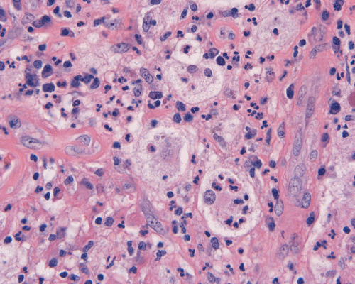 The etiology of RDD is unknown although a viral pathogenesis has been postulated. Numerous reports have identified human herpesvirus 6 (HHV-6) in visceral and cutaneous lesions 8. However, HHV-6 has frequently been found in many reactive and infectious disorders of lymphoid tissue, and its presence in Rosai-Dorfman disease is non-specific. Immunophenotypic profiling and studies of monokine expression suggest an origin from activated macrophages, which have been shown to produce IL-1-beta and and TNF-alpha. Molecular studies using polymorphic regions of the human androgen receptor locus have demonstrated that RDD is a polyclonal disorder 2.Extranodal involvement: