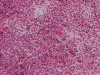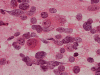 Pathology:Medulloblastomas usually have a relatively well defined demarcation from the non-neoplastic brain tissue. Extension to the leptomeningeal surface which lead to "sugar coating" appearance in MRI scan and on gross examination is rather characteristic. This feature, however, is not always present. Cut surfaces of the tumor is usually soft and pale. Necrosis can be present but is usually not extensive. Unfortunately, specimens submitted to for intra-operative frozen section consultation is almost always too small to appreciate these features. Instead, the biopsy material carry a rather characteristic thick mucus like paste.