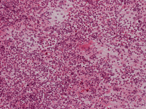 Histologically, our discussion will be limited to the conventional or classic type of medulloblastoma and large cell and anaplastic medulloblastoma. The conventional or classic type [Click here to see images of a classic medulloblastoma] is essentially a blue cell tumor with extremely high nuclear to cytoplasmic ratio. A solid sheet like growth without specific pattern formation is common. Homer Weight rosette can be seen but they are not frequent features. Fine threads of cytoplasm, also known as neuropils, are rather typical. On histologic sections, the nuclei are rather homogeneous in size. Morphologically, they resemble raisin or crumbling carrots. Mitotic figures are common. Cells with pyknotic nucleoli and apoptotic cells are usually present. necrosis may be seen and usually occur as small spotty areas. The histopathologic features on frozen sections are similar. Similar to other small blue cell tumors, however, preservation of nuclear details is usually suboptimal. Intraoperative cytologic preparations is the best remedy and would provide excellent cytologic and nuclear details. It should be noted that even though the nuclear appear homogeneous in size on fixed sections, a good range of variation in nuclear size with the smaller nuclei about one third the size of the largerest nuclei can be seen. The larger nuclei are often bilobed. The chromatin, regardless of the nuclear size, typically give a coarse, "dirty", hyperchromatic appearance. A large, prominent nuclei is not a classic features and when this particular feature is present, a diagnosis other than a classic medulloblastoma should be entertained. In well done cytologic preparation, a thin rim of cytoplasm can be seen in a small proportion of the nuclei. The majority of the nuclei, however, would exist as naked nuclei.